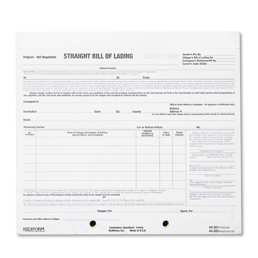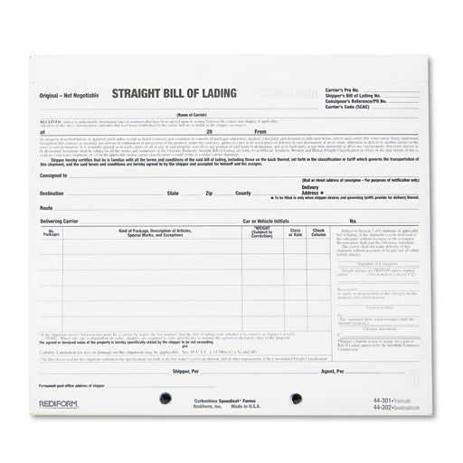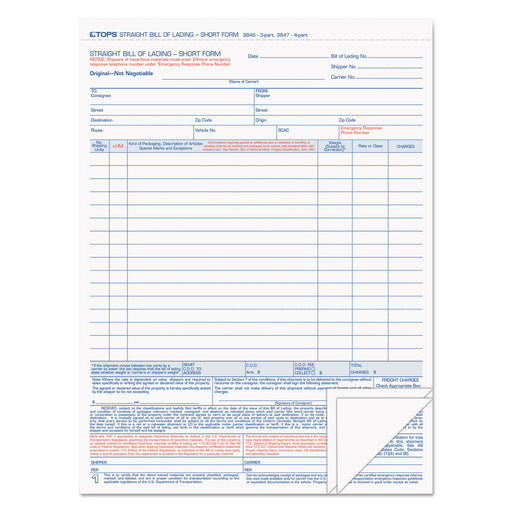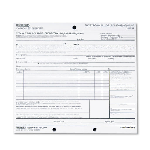 $0.00| /FORM,BILL/LADING,SHRT,TRIProvides accurate contractual wording for complete documentation. Punched to store in post binder. Carbonless Triplicate. ...