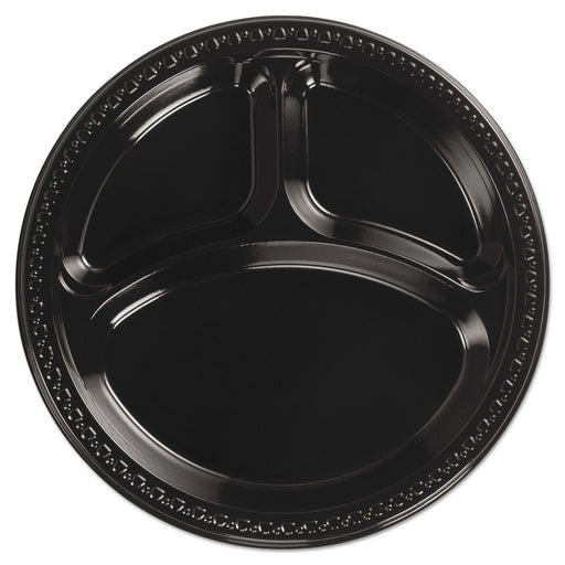 Heavyweight Plastic 3 Compartment Plates, 10 1/4" Dia, Black, 125/PK, 4 Packs/CT