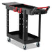 The heavy-duty adaptable cart provides superior versatility for tackling whatever task is at hand. Crafted of structural foam, this rolling service and utility cart can support up to 250 lb per shelf while reducing the need for time-consuming user modifications Features a variety of integrated features including an ergonomic adjustable handle with four positions for maximum comfort, a flip-up shelf, a slotted rim for small tool storage, two snap-in hooks for wrapping extension cords and locking casters to keep the cart stable during use. Color: Black; Color Family: Black; Capacity (Weight): 500 lbs; Caster/Glide/Wheel: Four Casters (2 Locking).