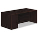 A modular management solution that combines stylish profiles and elegant accents with top-grade fit and finish. Abrasion- and stain-resistant high-pressure laminate with elegant hardwood trim. Drawers ride on steel ball bearing suspensions; file drawer extends fully and accommodates letter and legal size hanging files, box drawers extend three-quarters. HON® “One Key" core removable locks make re-keying quick and easy. 10-1/2" conference overhang provides added kneespace for guests. Full-height modesty panel for privacy. Convenient cable management with two worksurface grommets. Color: Mahogany; Color Family: Mahogany; Pedestal Count: 1; Top Shape: Rectangular.