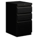 Heavy-duty pedestals with radius pulls to complement Brigade™ 800 Series Lateral Files. High sides for front-to-back letter size filing. Ball bearing suspensions on file drawer (90% extension) and box drawer (75%) extension. HON® "One Key" interchangeable lock core. Counterweight inhibits tipping when opening more than one drawer. Fixed front casters; swivel back casters. Fits under 29 1/2" high worksurfaces. Box/Box/File, Pencil tray in top drawer. Color: Black; Color Family: Black; Overall Width: 15"; Overall Depth: 19.88".