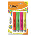 BIC Brite Liner® Grip Highlighters feature super-bright fluorescent ink for attention-grabbing highlighting and a textured rubber grip for added comfort. Chisel tip is ideal for both broad highlighting and fine underlining. Won't dry out if the cap is left off for eight hours. Color(s): Assorted; Color Family: Multicolor; Assortment: Fluorescent Blue; Fluorescent Green; Fluorescent Pink; Fluorescent Yellow; Tip Type: Chisel.
