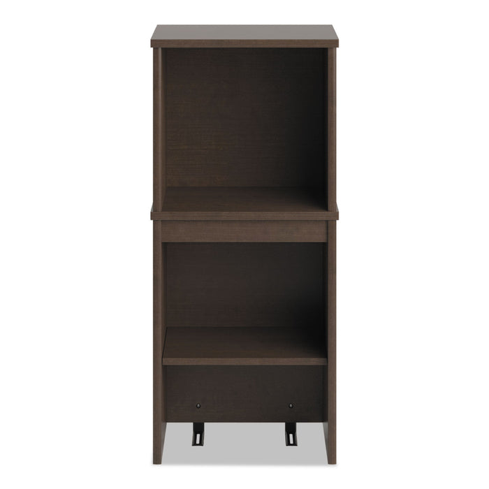 Envoy Collection 16W Narrow Hutch provides flexibility for a range of workplace solutions. This attractive, easy-to-assemble hutch increases the vertical storage in your office, plus mounts directly onto the 3-Drawer Pedestal or 2-Drawer Lateral File (sold separately) and includes one adjustable and two fixed shelves. Enjoy stylish profile edge detail on uprights with grooved edge banding accents. Hutch is made of durable, thermally fused laminate to provide superior resistance to scratches and stains. The Envoy Collection creates design integrity for small spaces, home or business offices or multi-person work areas. Color: Mocha Cherry; Color Family: Cherry; Overall Width: 16"; Overall Depth: 14.25".