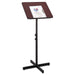 Speaker podium ideal for presentations requiring no support equipment. Podium height adjusts from 30" to 44". Reading platform tilts from flat position to 70°. Paper stop keeps materials secure at all viewing angles. Designed with wood laminate top and black trim. Features steel base with floor levelers. Color: Mahogany/Black; Color Family: Mahogany; Overall Width: 21"; Overall Depth: 21".