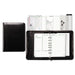 Luxurious, black bonded leather cover. Constructed to withstand heavy wear and tear; zipper closure secures contents. Includes a three-month sample of undated planning pages in three formats: one page per day, two pages per day and two pages per week. Starter set accessories include a page locator, 24-sheet lined note pad, telephone/address directory plus a vinyl business/credit card holder and vinyl pouch. Cover features include interior organizing pockets, file pocket, note pad pocket, I.D. window, credit card/business card pockets and a pen loop. Organizer cover is binder style with seven 3/4" rings so pages stay secure. Size: 8.5 x 5.5; Page Color/Theme: White; Appointment Ruling: Open Scheduling; Julian Dates: No.