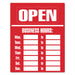 Business Hours 15" x 19" sign allows you to display your business hours along with a rotatable "Open" and "Closed" sign. Static cling letters and numbers included. Frame Color: Red; Size: 15 x 19; Message(s): Business Hours; Material(s): Plastic.