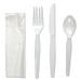 Why stock four items when you can have all of them in one convenient package? This kit contains a fork, spoon, knife, and napkin, allowing you to cover all of your bases with a single, high-quality item. Utensils Type: Fork; Knife; Napkin; Teaspoon; Material(s): Polystyrene; Color(s): White; Grade: Heavyweight.